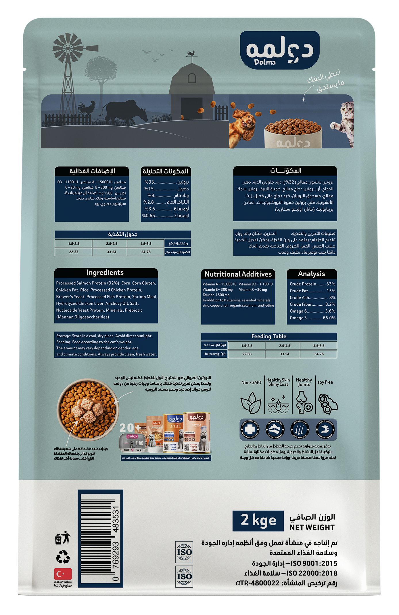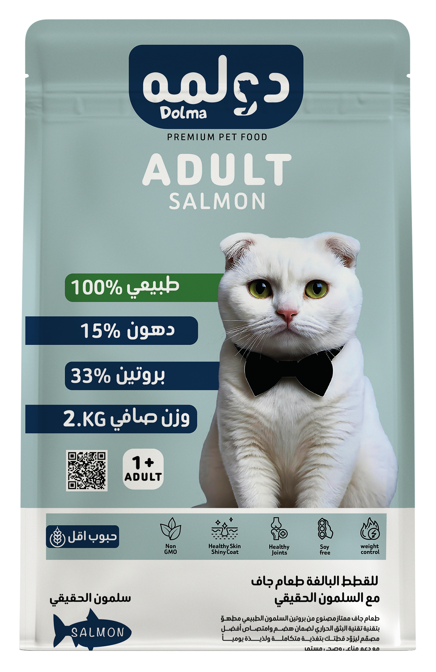 طعام جاف متوازن بالسلمون، غني بالبروتين للقطط البالغة.